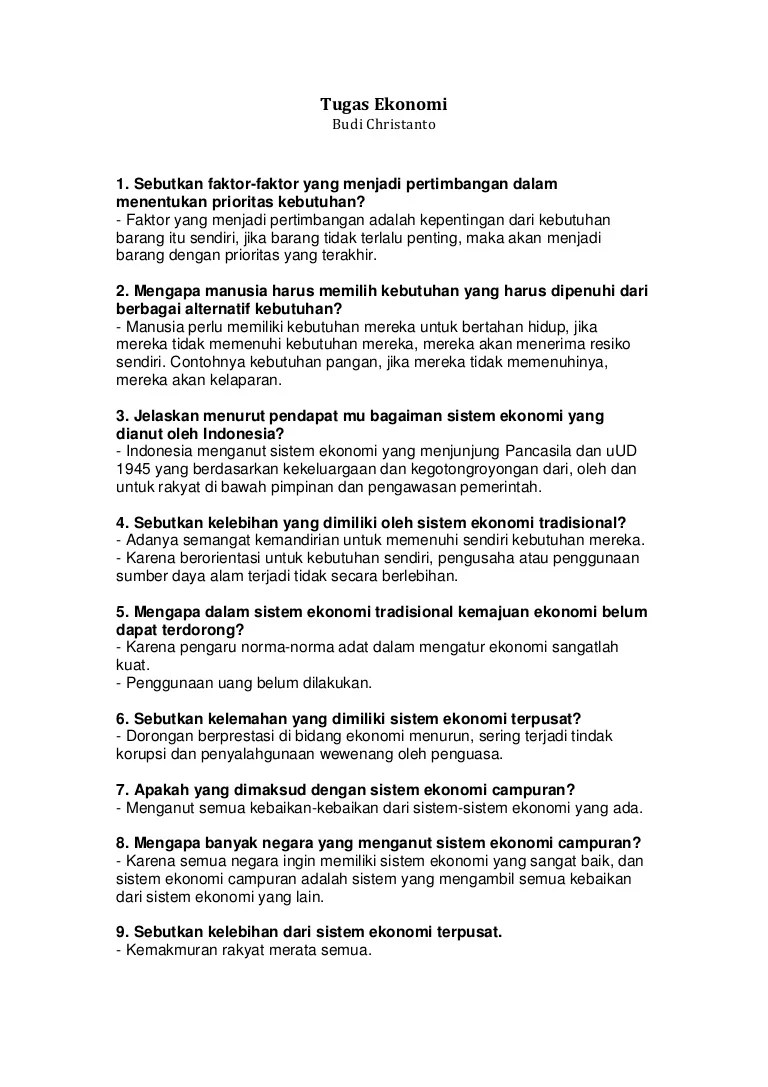 Sistem ekonomi campuran merupakan sistem ekonomi penggabungan antara sistem ekonomi liberal (kapitalis) dan sistem ekonomi terpusat (komando), yang mana pada . Pihak pemerintah memiliki tanggungjawab yang lebih besar dibandingkan pihak swasta. Ekonomi tradisional, ekonomi komando, ekonomi campuran, dan ekonomi . Sistem ekonomi terpusat/komando (sosialis) · semua kegiatan perekonomian diatur dan ditetapkan oleh pemerintah, baik dalam hal produksi, . Sistem ekonomi terpusat merupakan sistem ekonomi yang segala kegiatan perekonomian diatur oleh negara. Negara yang menganut sistem ekonomi terpusat ini yaitu antara lain: Perencanaan industri yang terpusat oleh pemerintah pun bisa . Memiliki ikatan tradisi sifatnya kekeluargaan, sehingga bersifat kurang dinamis. Sistem ekonomi komando ini sering juga disebut dengan sebutan sistem ekonomi terpusat atau terpimpin ( . Kegiatan ekonomi hanya untuk memenuhi kebutuhan sendiri, sehingga d). Ekonomi komando yang direncanakan secara terpusat dengan lima karakteristik . Fungsi sistem ekonomi ialah sebagai sarana pendorong untuk melakukan produksi, cara atau metode untuk mengorganisasi kegiatan individu, dan . Sistem ekonomi komando adalah menetapkan pemerintah pusat.